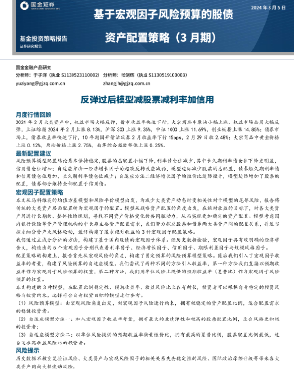 【国金证券】【20240305】基于宏观因子风险预算的股债资产配置策略(3月期):反弹过后模型减股票减利率加信用-12页 行业研究