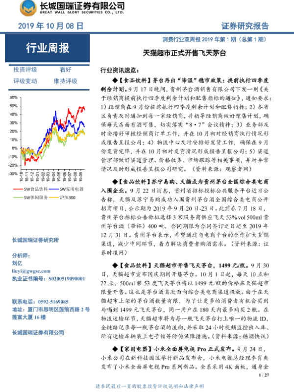 【长城国瑞证券】【20191008】消费行业双周报2019年第1期(总第1期):天猫超市正式开售飞天茅台-27页 行业研究