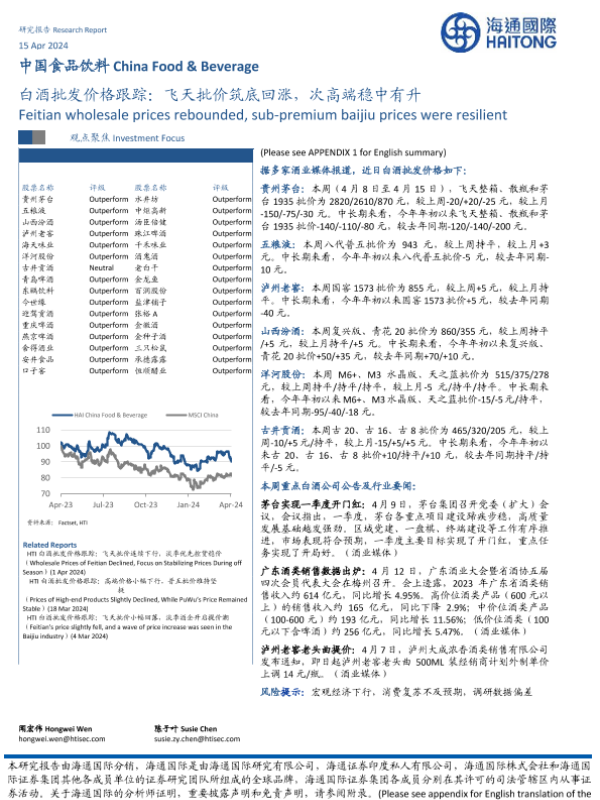 【海通国际】【20240415】食品饮料行业白酒批发价格跟踪:飞天批价筑底回涨,次高端稳中有升-10页 行业研究