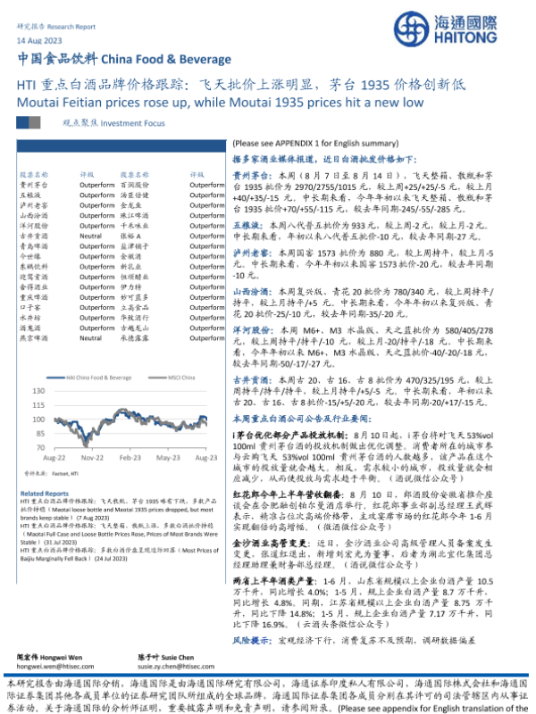 【海通国际】【20230814】HTI重点白酒品牌价格跟踪:飞天批价上涨明显,茅台1935价格创新低-13页 行业研究