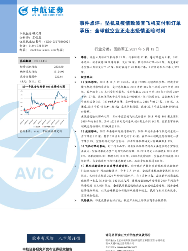 【中航证券】【20210513】国防军工行业点评:坠机及疫情波音飞机交付和订单承压;全球航空业正走出疫情至暗时刻-4页 证券期货研究报告