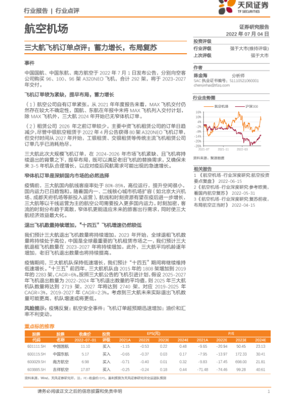 【天风证券】【20220704】三大航飞机订单点评:蓄力增长,布局复苏-3页 行业研究