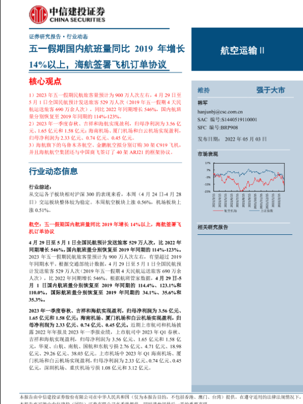 【中信建投证券】【20230503】航空运输行业:五一假期国内航班量同比2019年增长14%以上,海航签署飞机订单协议-25页 行业研究