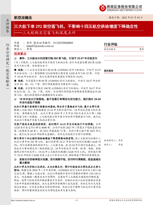 【浙商证券】【20220703】三大航购买空客飞机深度点评:292架空客飞机订单不影响航空供给增速下降确定性-3页 行业研究