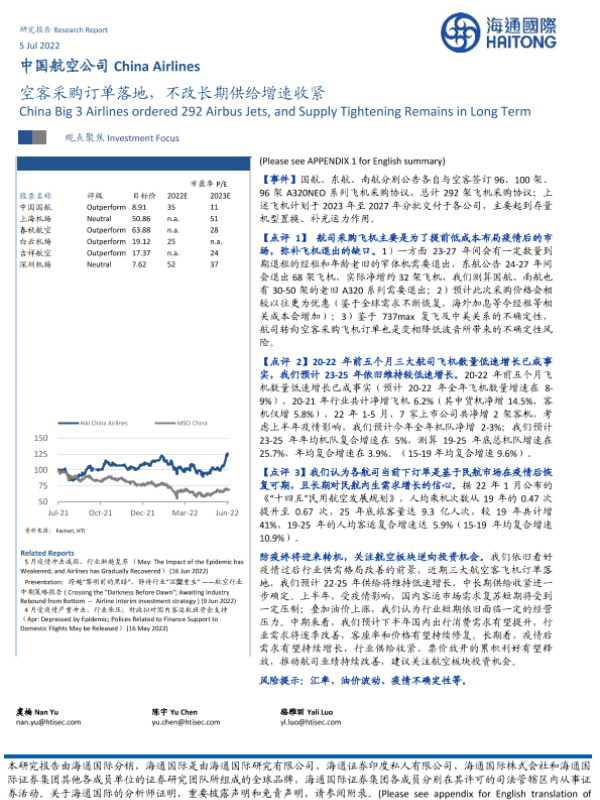 【海通国际】【20220705】中国航空公司:空客采购订单落地,不改长期供给增速收紧-14页 行业研究