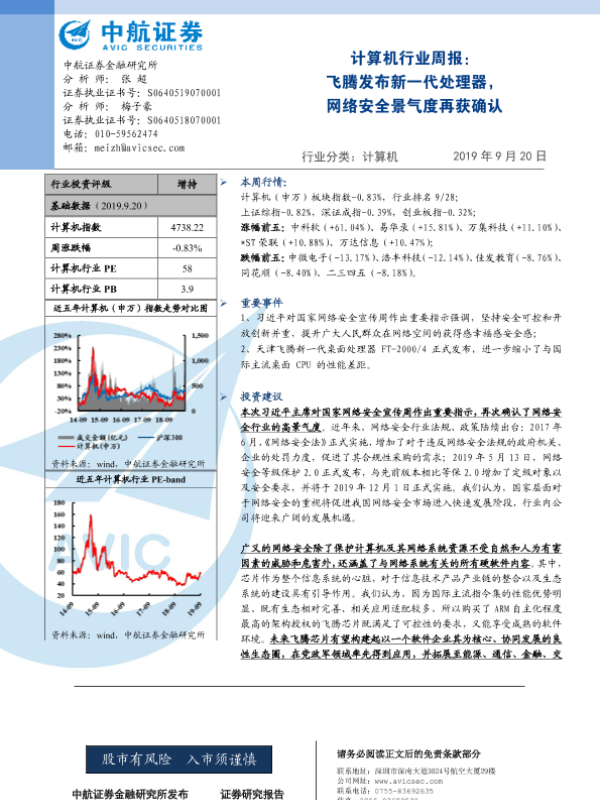 【中航证券】【20190920】计算机行业周报:飞腾发布新一代处理器,网络安全景气度再获确认-3页 证券期货研究报告