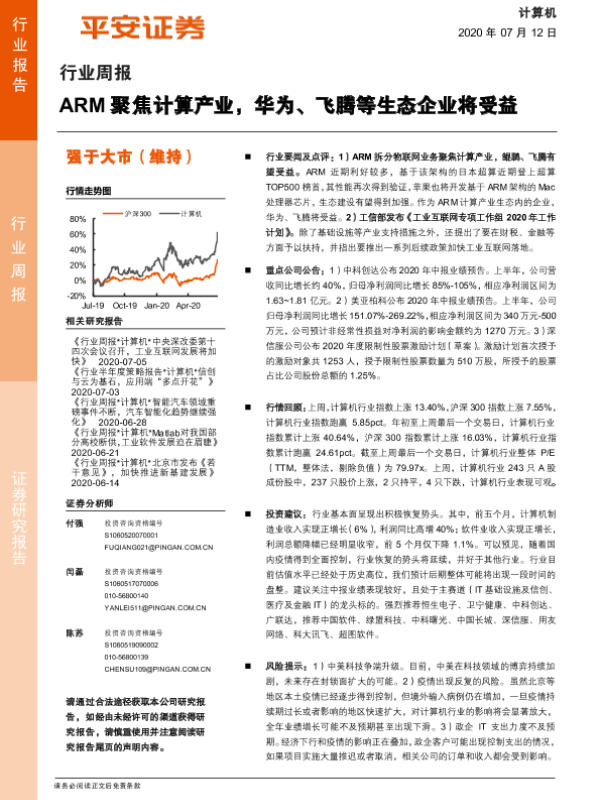 【平安证券】【20200712】计算机行业周报:ARM聚焦计算产业,华为、飞腾等生态企业将受益-6页 行业研究