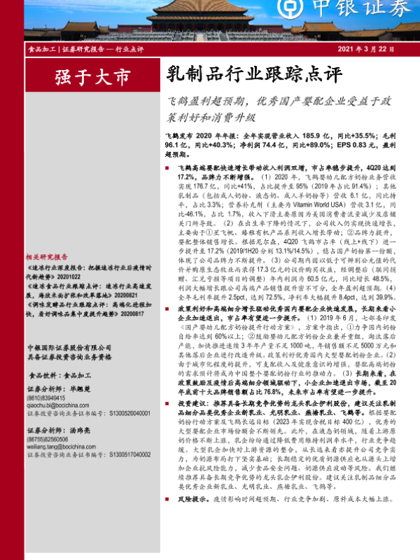 【中银证券】【20210322】20210322-中银证券-乳制品行业跟踪点评:飞鹤盈利超预期,优秀国产婴配企业受益于政策利好和消费升级-4页 行业研究