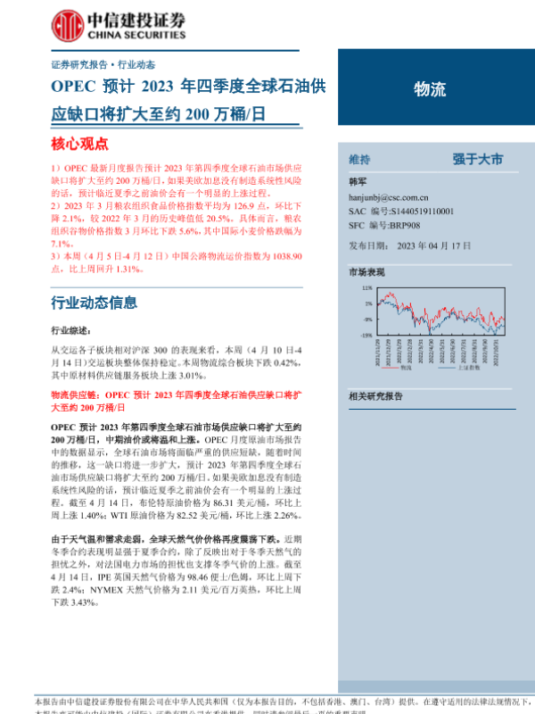 【中信建投证券】【20230417】物流行业:OPEC预计2023年四季度全球石油供应缺口将扩大至约200万桶日-20页 行业研究