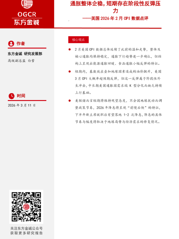 【东方金诚】【202603】通胀整体企稳,短期存在阶段性反弹压力——美国 2026年 2月 CP I数据点评-7页 宏观策略