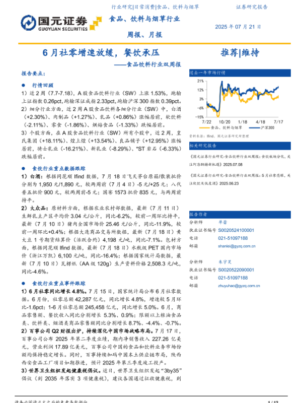 【国元证券】【20250721】6月社零增速放缓,餐饮承压——食品饮料行业双周报-12页 行业研究