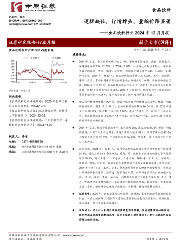 【中原证券】【20250103】食品饮料行业2024年12月月报:逻辑缺位,行情掉头,量缩价降显著-12页 行业研究