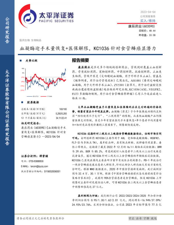 【太平洋证券】【20230404】血凝酶迎手术量恢复+医保解限,KC1036针对食管鳞癌显潜力-24页 行业研究