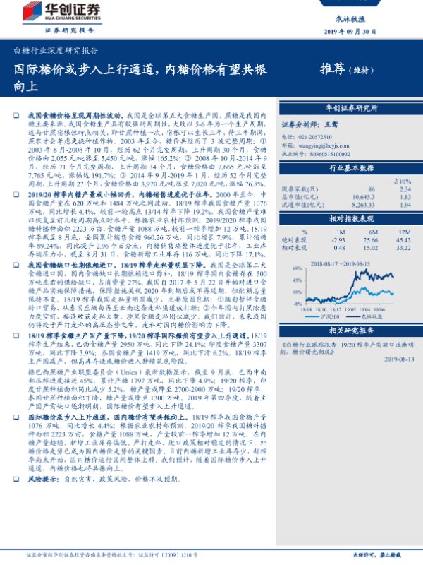 【华创证券】【20190930】20190930-华创证券-白糖行业深度研究报告:国际糖价或步入上行通道,内糖价格有望共振向上-28页 行业研究