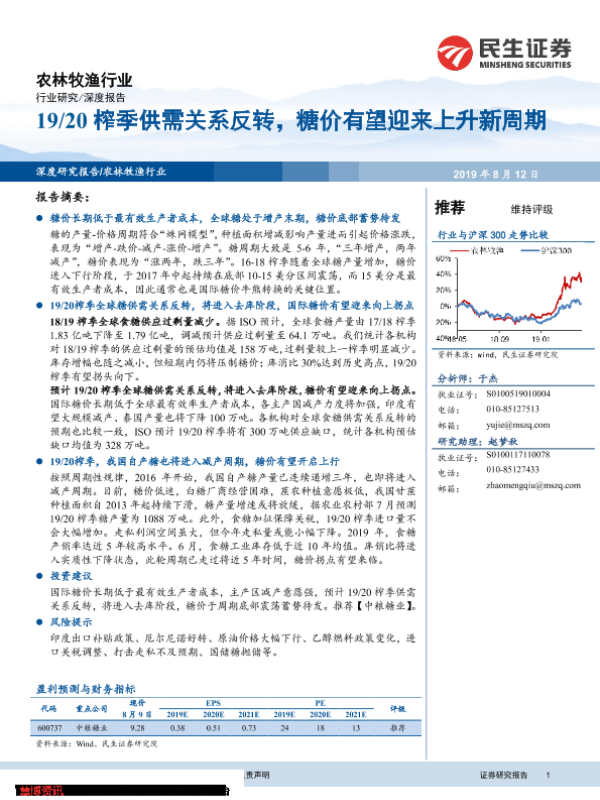 【民生证券】【20190812】19 20榨季供需关系反转,糖价有望迎来上升新周期-29页 行业研究