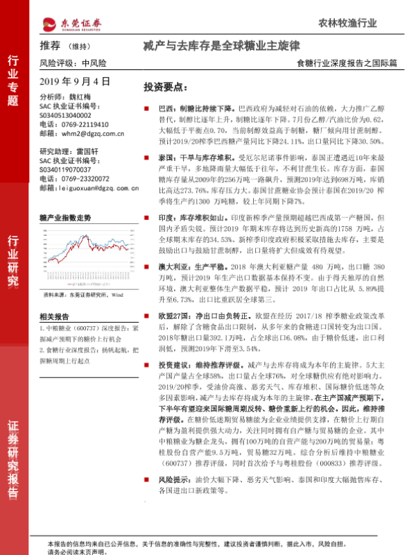 【东莞证券】【20190904】20190904-东莞证券-食糖行业深度报告之国际篇:减产与去库存是全球糖业主旋律-27页 行业研究