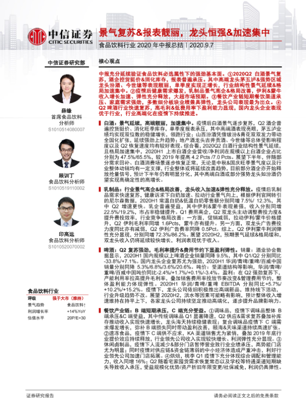 【中信证券】【20200907】食品饮料行业2020年中报总结:景气复苏&报表靓丽,龙头恒强&加速集中-23页 行业研究