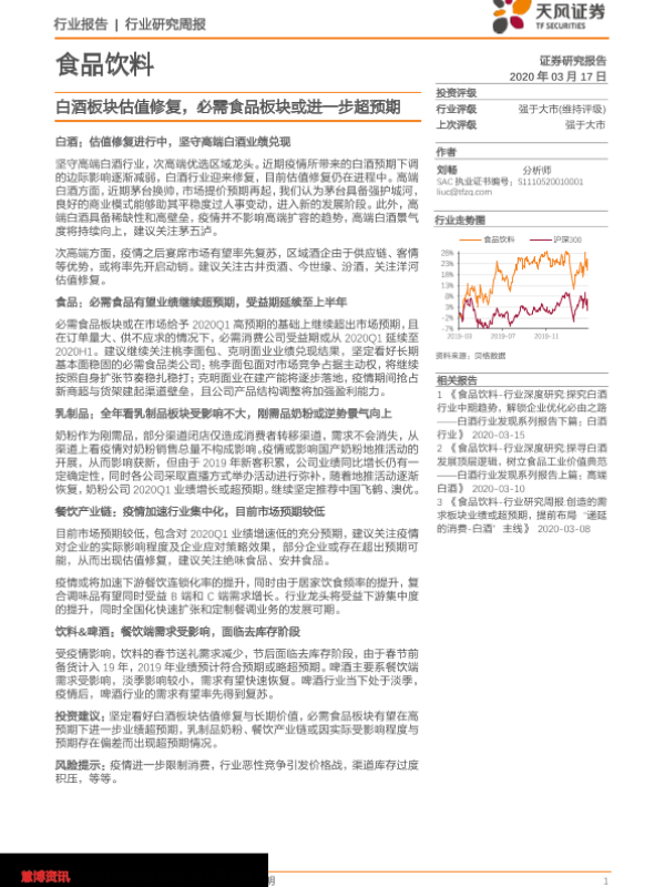 【天风证券】【20200317】食品饮料行业研究周报:白酒板块估值修复,必需食品板块或进一步超预期-9页 行业研究