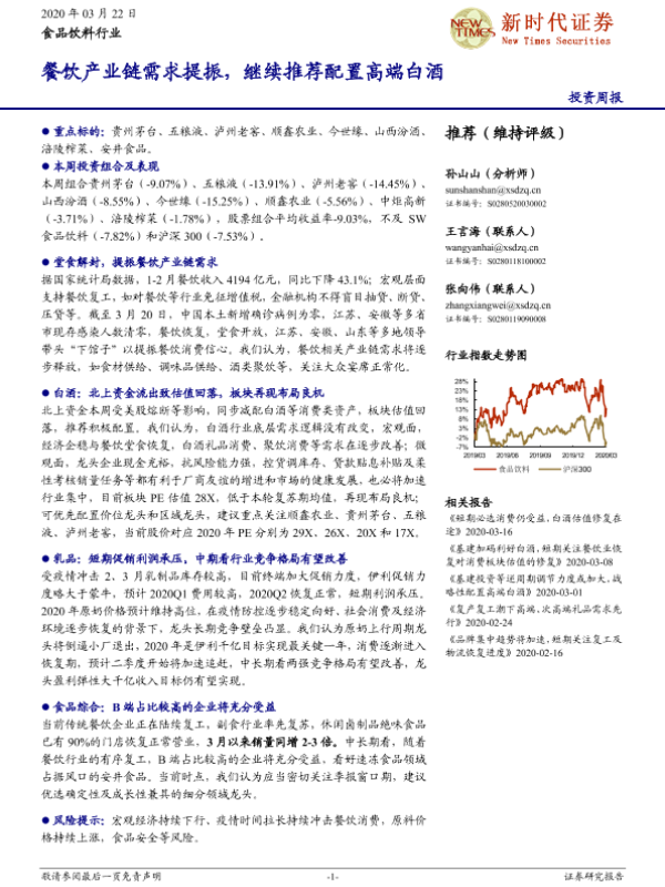 【新时代证券】【20200322】20200322-新时代证券-食品饮料行业投资周报:餐饮产业链需求提振,继续推荐配置高端白酒-18页 行业研究
