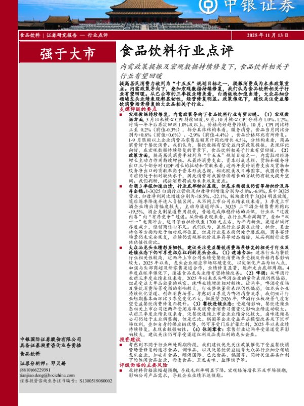 【中银证券】【202510】食品饮料行业点评:内需政策提振及宏观数据持续修复下,食品饮料相关子行业有望回暖-5页 证券期货研究报告
