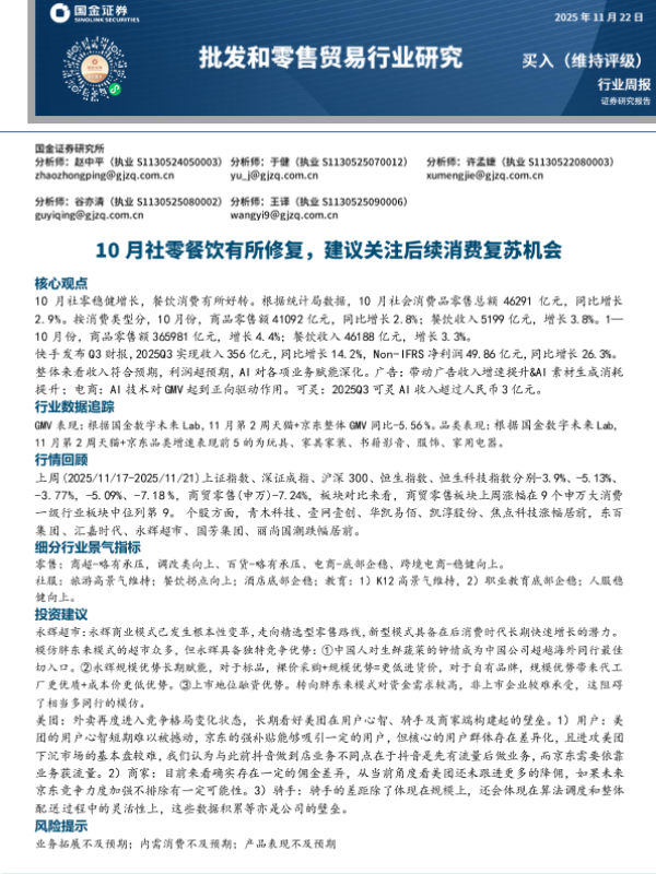 【国金证券】【202511】批发和零售贸易行业周报:10月社零餐饮有所修复,建议关注后续消费复苏机会-8页 证券期货研究报告