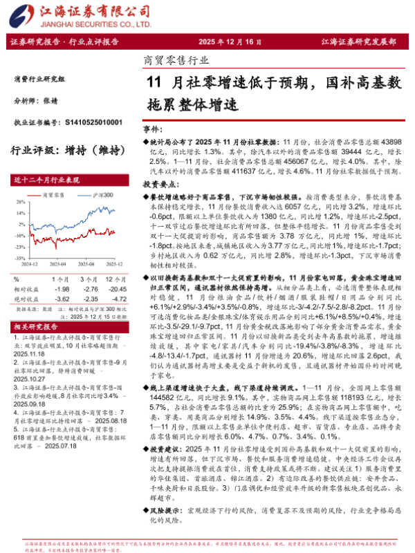 【江海证券】【202512】商贸零售行业_11月社零增速低于预期_国补高基数拖累整体增速-3页 证券期货研究报告