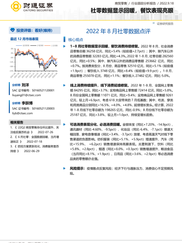 【财通证券】【20220918】2022年8月社零数据点评-社零数据显示回暖,餐饮表现亮眼-11页 行业研究