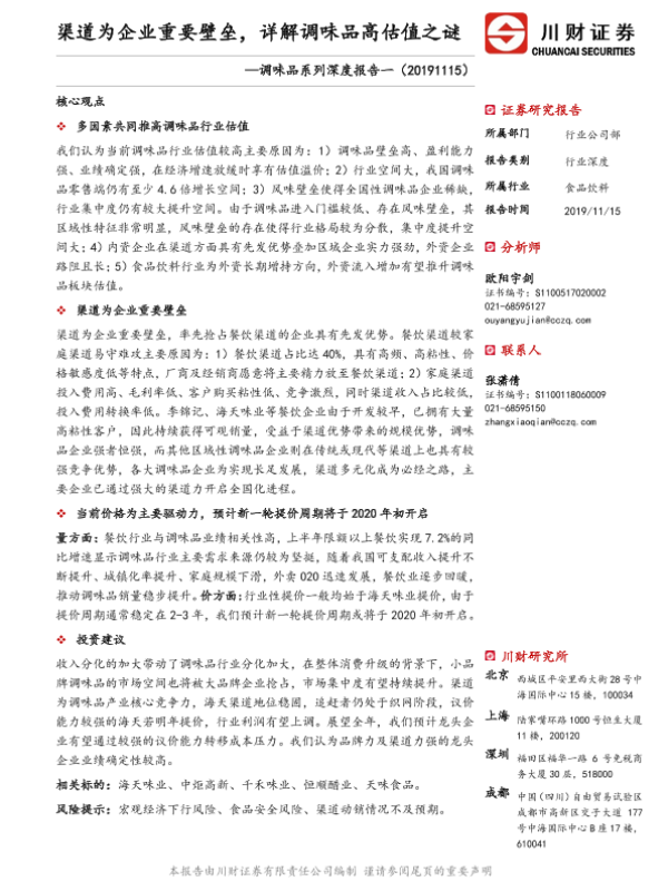【川财证券】【20191115】渠道为企业重要壁垒,详解调味品高估值之谜-40页 证券期货研究报告