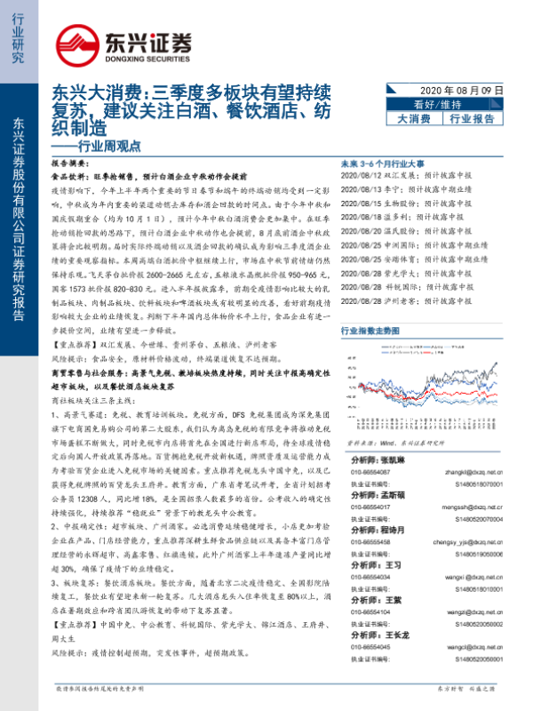 【东兴证券】【20200809】三季度多板块有望持续复苏,建议关注白酒、餐饮酒店、纺织制造-22页 行业研究