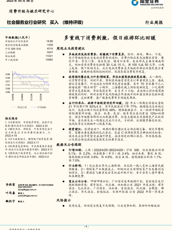 【国金证券】【20220504】社会服务业行业研究:多重线下消费刺激,假日旅游环比回暖-14页 行业研究