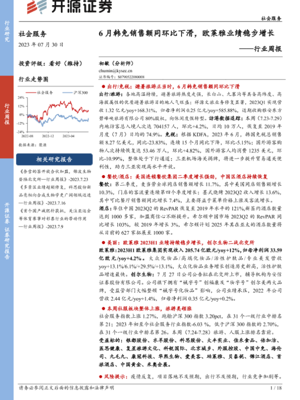 【开源证券】【20230730】6月韩免销售额同环比下滑,欧莱雅业绩稳步增长-18页 行业研究