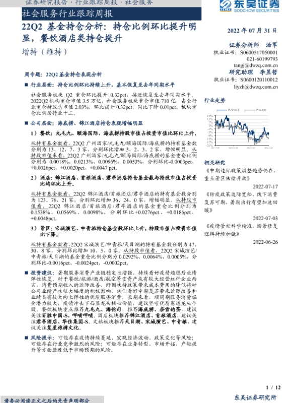 【东吴证券】【20220731】社会服务行业跟踪周报:22Q2基金持仓分析-12页 行业研究