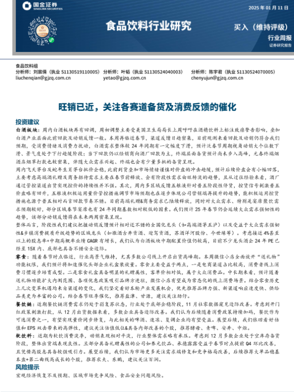 【国金证券】【20250111】20250111-国金证券-食品饮料行业周报:旺销已近,关注各赛道备货及消费反馈的催化-10页 行业研究