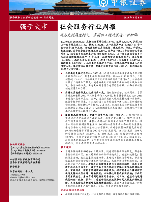 【中银证券】【20230305】社会服务行业周报:离岛免税热度持久,多国出入境政策进一步松绑-22页 行业研究