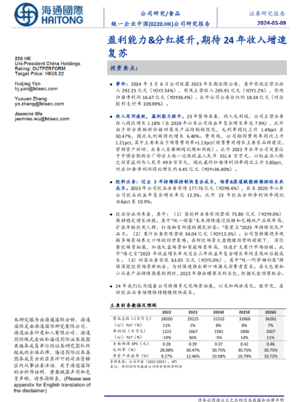 【海通国际】【20240309】统一企业中国(0220.HK)公司研究报告:盈利能力&分红提升,期待24年收入增速复苏-12页 行业研究