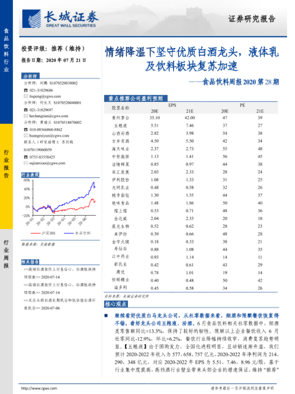 【长城证券】【20200721】食品饮料周报2020第28期:情绪降温下坚守优质白酒龙头,液体乳及饮料板块复苏加速-13页 行业研究