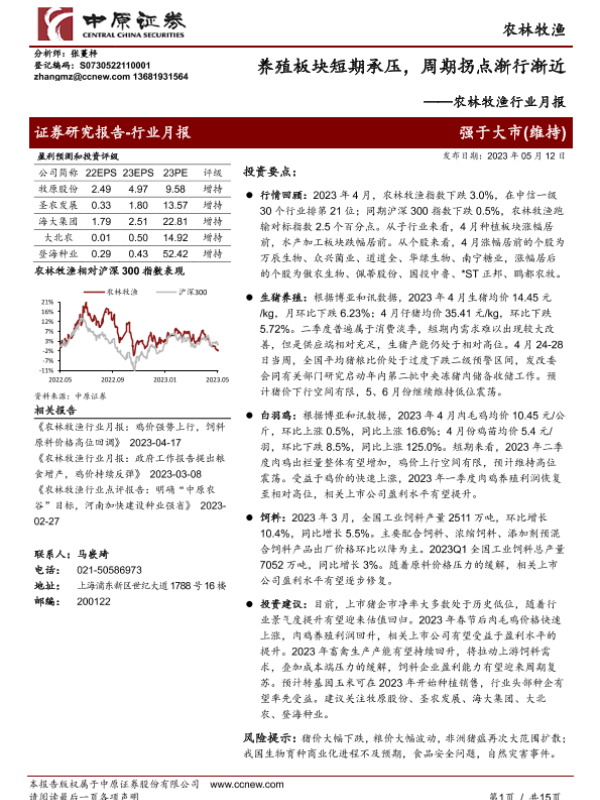 【中原证券】【20230512】20230512-中原证券-农林牧渔行业月报:养殖板块短期承压,周期拐点渐行渐近-15页 行业研究