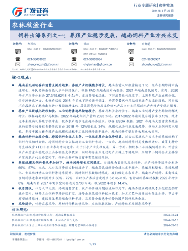 【广发证券】【20240325】饲料出海系列之一:养殖产业稳步发展,越南饲料产业方兴未艾-25页 行业研究