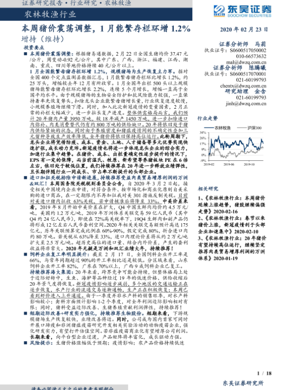 【东吴证券】【20200223】20200223-东吴证券-农林牧渔行业:本周猪价震荡调整,1月能繁存栏环增1.2%-18页 行业研究