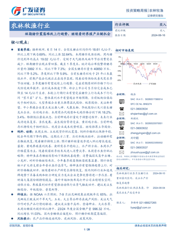 【广发证券】【20240616】20240616-广发证券-农林牧渔行业投资策略周报:短期猪价震荡难改上行趋势,继续看好养殖产业链机会-28页 行业研究