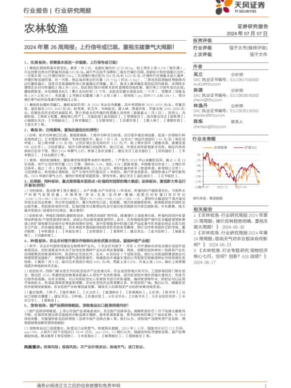 【天风证券】【20240707】2024年第26周周报:上行信号或已现,重视生猪景气大周期!-15页 行业研究