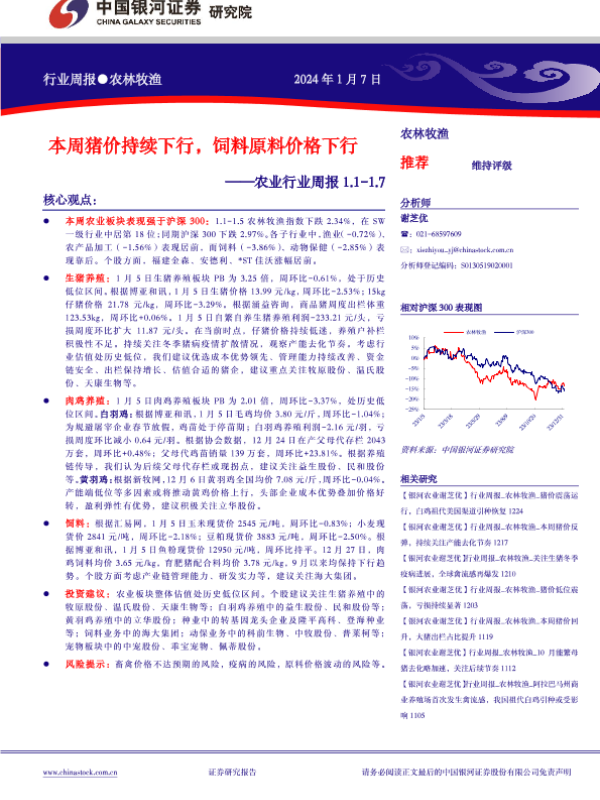 【银河证券】【20240107】20240107-中国银河-农业行业周报:本周猪价持续下行,饲料原料价格下行-15页 行业研究