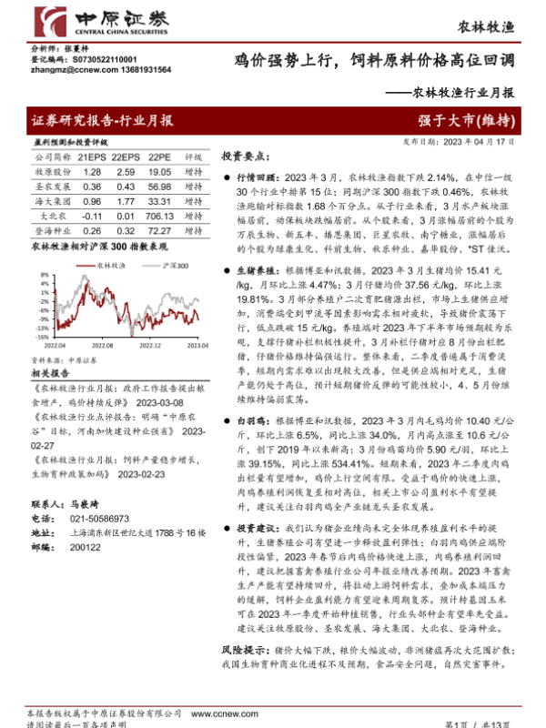 【中原证券】【20230417】农林牧渔行业月报:鸡价强势上行,饲料原料价格高位回调-13页 行业研究