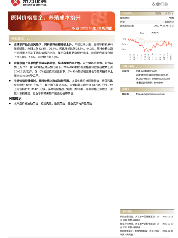 【东方证券】【20220312】农业2022年第10周周报:原料价格高企,养殖成本抬升-8页 行业研究