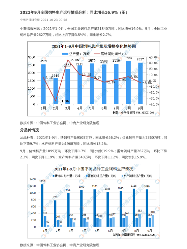 【中商产业研究院】【20211023】2021年9月全国饲料生产运行情况分析-2页 行业研究