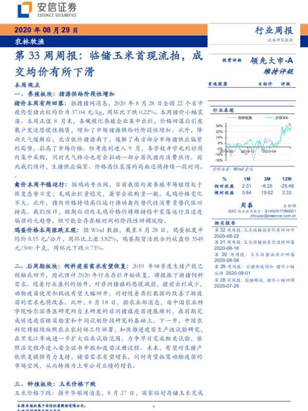 【安信证券】【20200829】20200829-安信证券-农林牧渔第33周周报:临储玉米首现流拍,成交均价有所下滑-23页 行业研究
