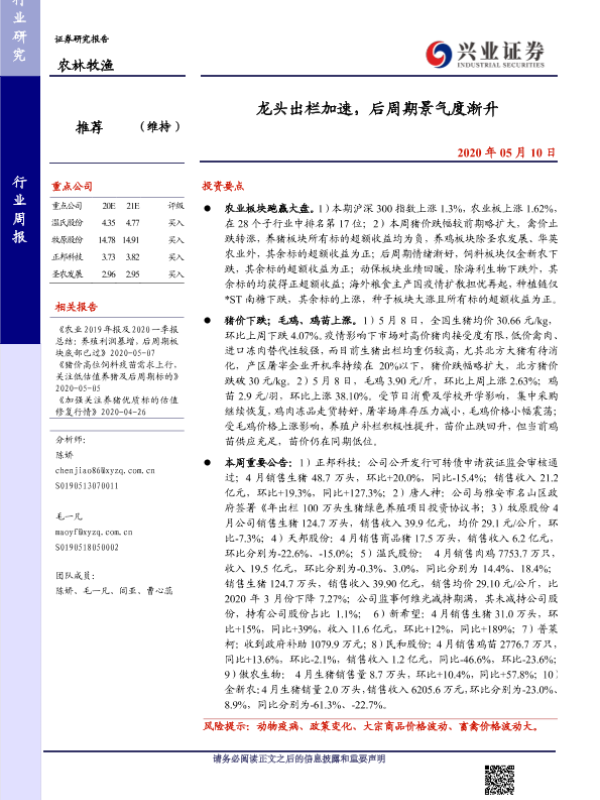 【兴业证券】【20200510】20200510-兴业证券-农林牧渔行业周报:龙头出栏加速,后周期景气度渐升-15页 行业研究