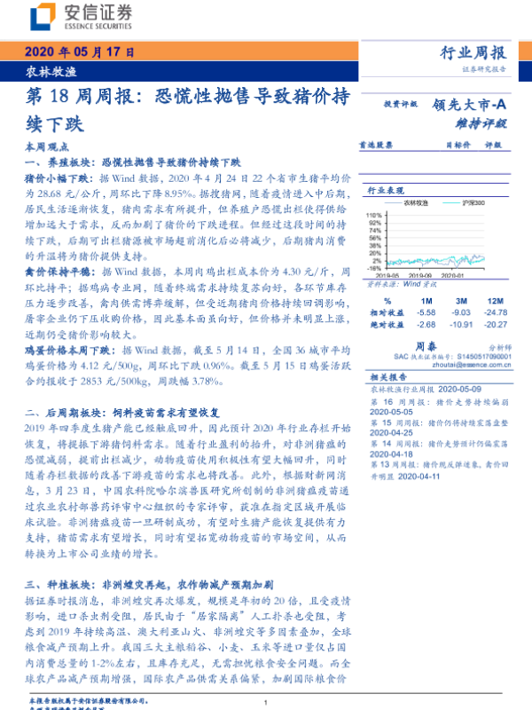 【安信证券】【20200517】第18周周报:恐慌性抛售导致猪价持续下跌-20页 行业研究
