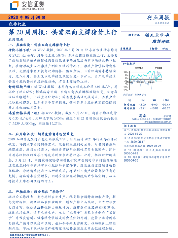 【安信证券】【20200530】第20周周报:供需双向支撑猪价上行-23页 行业研究