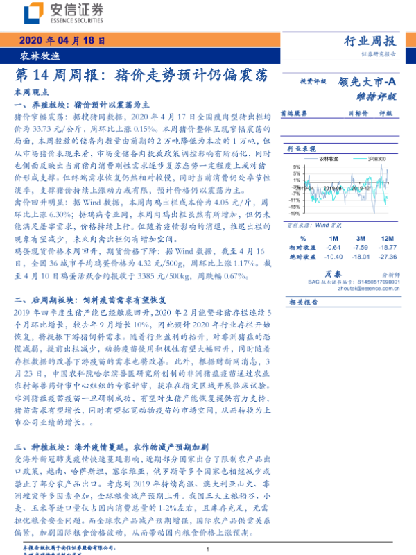 【安信证券】【20200418】农林牧渔第14周周报:猪价走势预计仍偏震荡-24页 行业研究